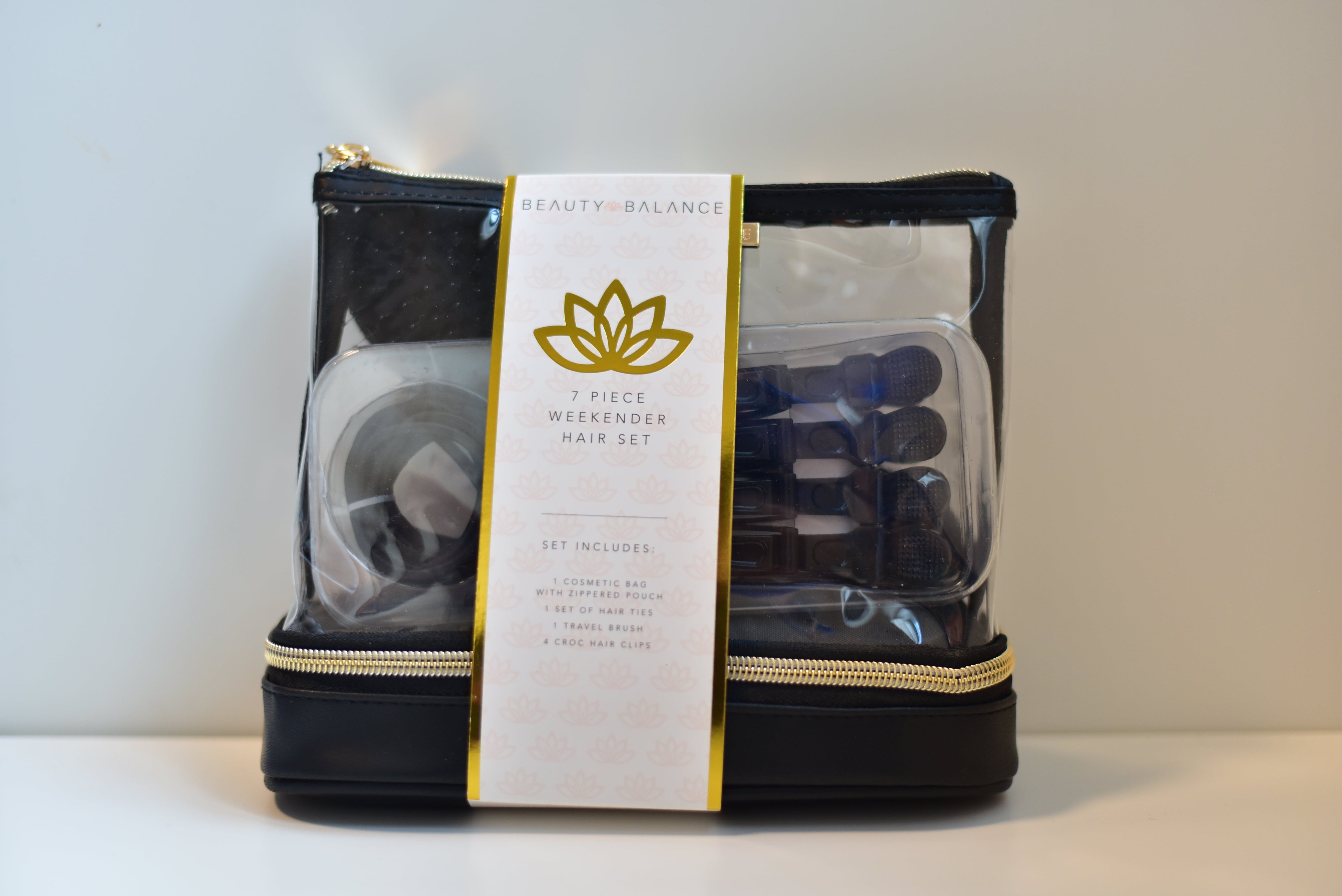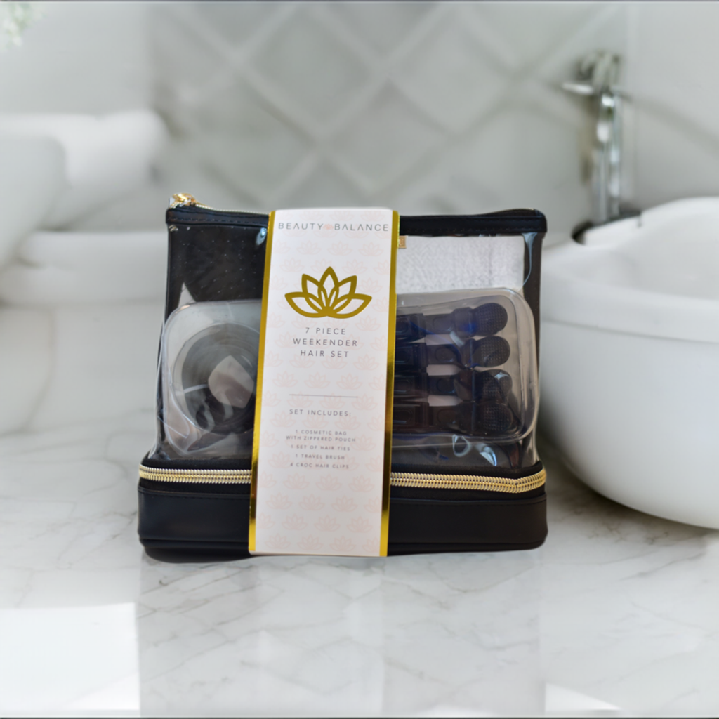 This Weekender Hair Set Includes a chic cosmetic bag with a zipper pouch for easy organization