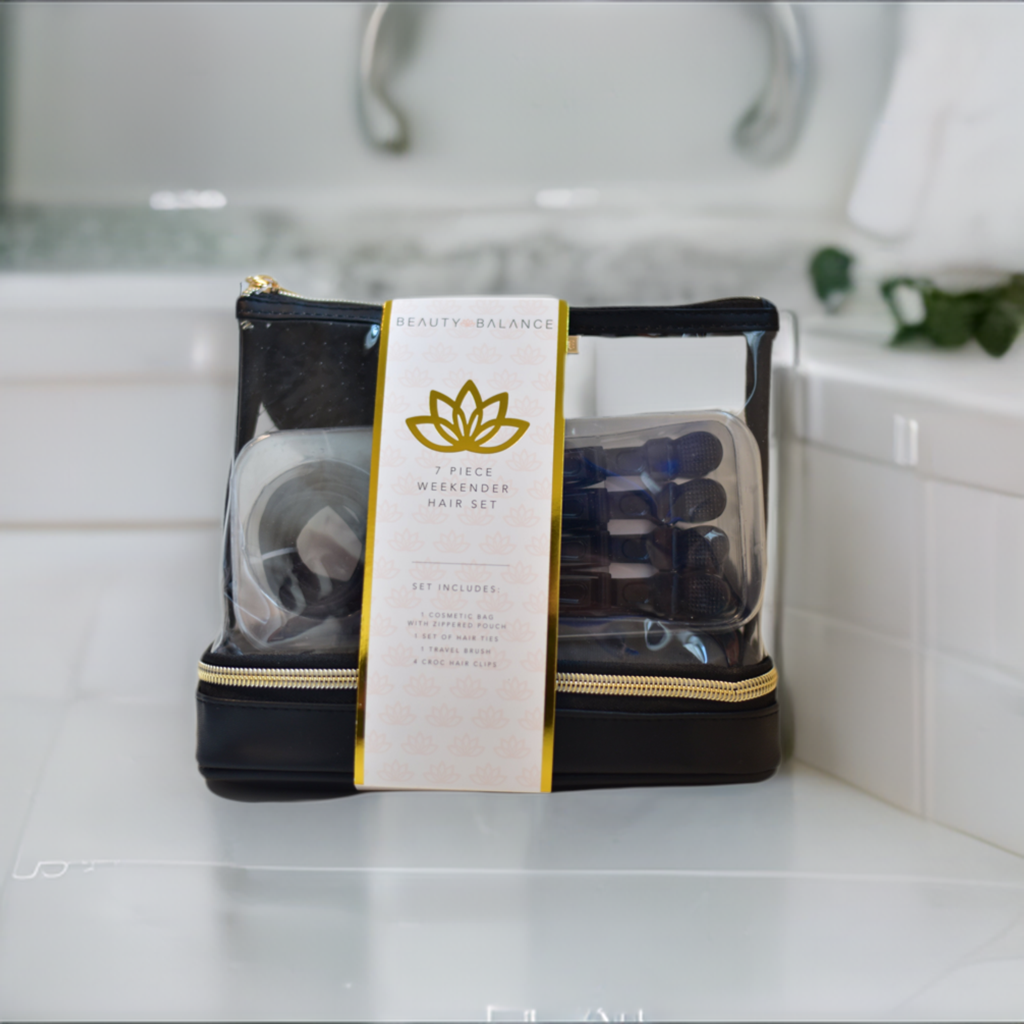 Introducing the 7 Piece Weekender Hair Set—a stylish essential for travelers on the move! Packed in a chic cosmetic bag with a handy zipper pouch, this set includes hair ties, a compact travel brush, and four trendy Croc hair clips. Perfect for maintaining flawless hair wherever you roam, it's your go-to for convenience and style, all in one sleek package.