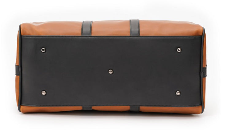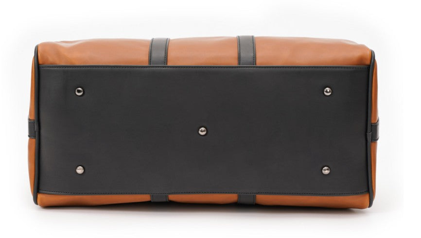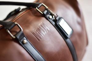 This brown leather duffle bag has a strap for stacking over suitcases, ensuring an effortless hands-free mobility and stress-free travel experience.