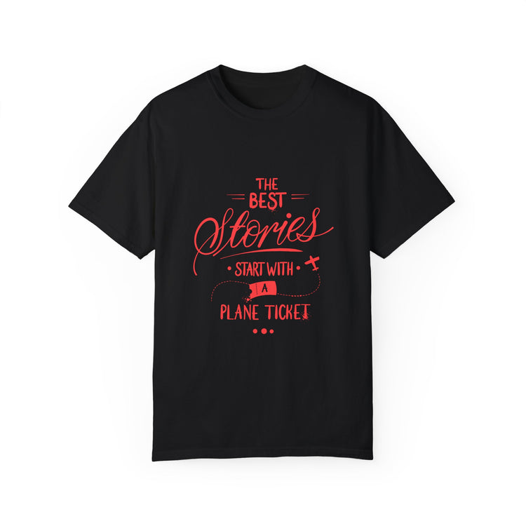 Embrace your wanderlust with "The Best Stories Start with a Plane Ticket" Travel Quote T-Shirt. A fully customizable tee made 100% with ring-spun cotton. The soft-washed, garment-dyed fabric brings extra coziness to your wardrobe, while the relaxed fit makes it an excellent daily choice. The double-needle stitching throughout the tee makes it highly durable, while the lack of side seams helps the shirt retain its tubular shape.
